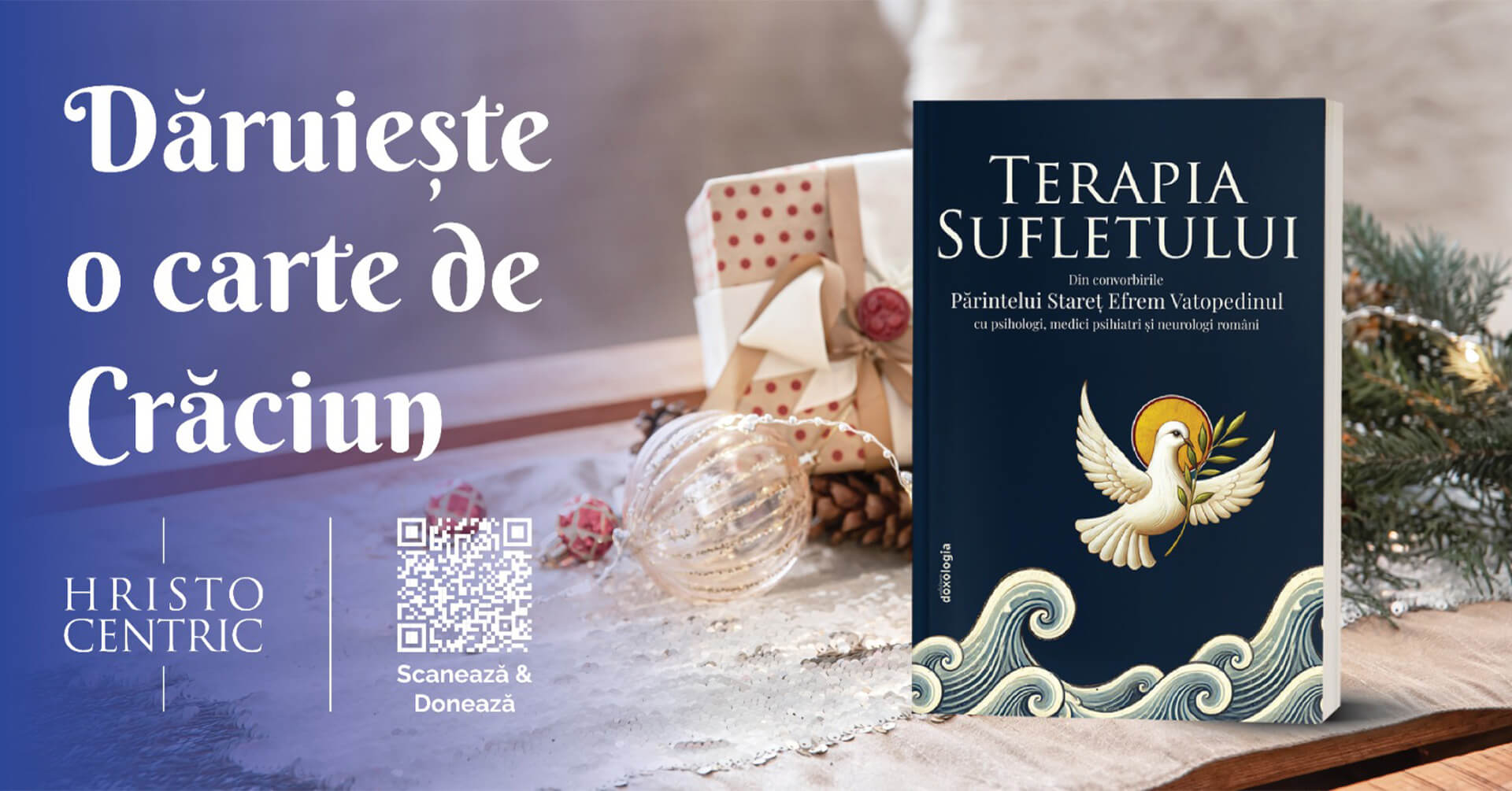 Cartea propusă ca dar de Crăciun este „Terapia Sufletului – Din convorbirile Părintelui Stareț Efrem Vatopedinul cu psihologi, medici psihiatri și neurologi români”, apărută la Editura Doxologia. Volumul reprezintă una dintre cele mai importante lucrări contemporane care pun în dialog spiritualitatea ortodoxă și științele minții, reunind dialogurile din cadrul a șapte sinaxe la care au luat parte membri ai comunității Hristocentric.